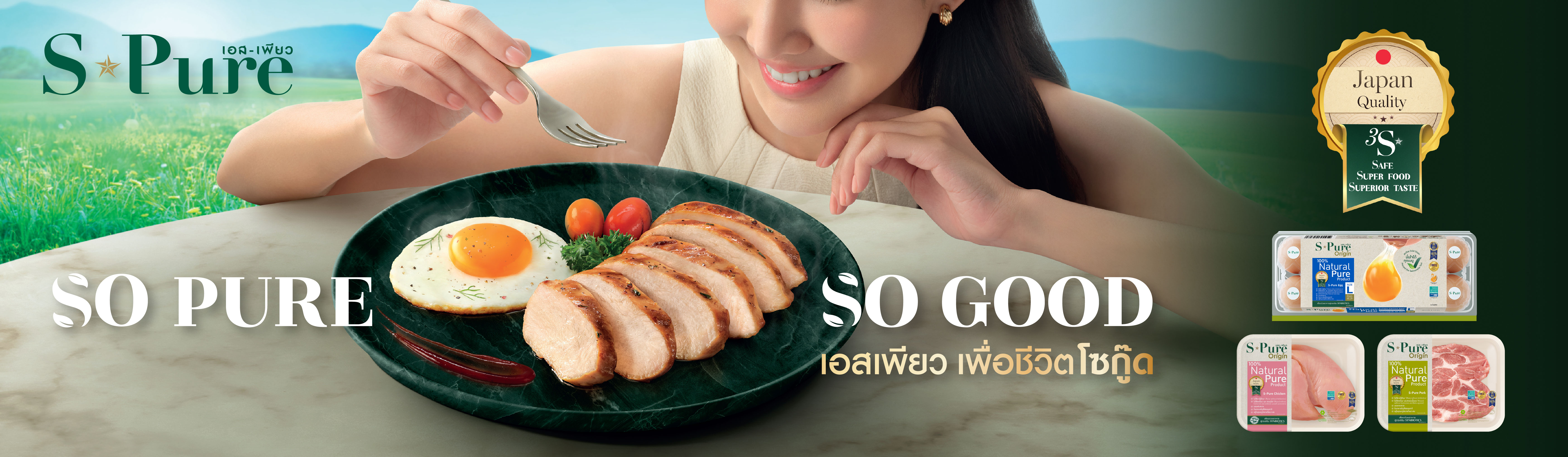 S-Pure ใส่ใจดูแลตั้งแต่วันแรก เริ่มจากกินดี เลี้ยงด้วยอาหารที่มีประโยชน์ เลี้ยงด้วยอาหารสูตรเสริม Synbiotics เสริมภูมิคุ้มกัน ให้สัตว์แข็งแรงไม่ป่วย อยู่สบาย ในสภาพแวดล้อมที่ดี ใส่ใจตรวจสุขภาพสม่ำเสมอ เพื่อให้ได้วัตถุดิบคุณภาพที่ดีที่สุด ที่จะทำให้ชีวิตของคุณดีขึ้นตั้งแต่วันแรกที่เริ่มทาน เพื่อส่งต่อคุณภาพจากฟาร์มเรา สู่สุขภาพที่ยั่งยืนบนจานคุณ
